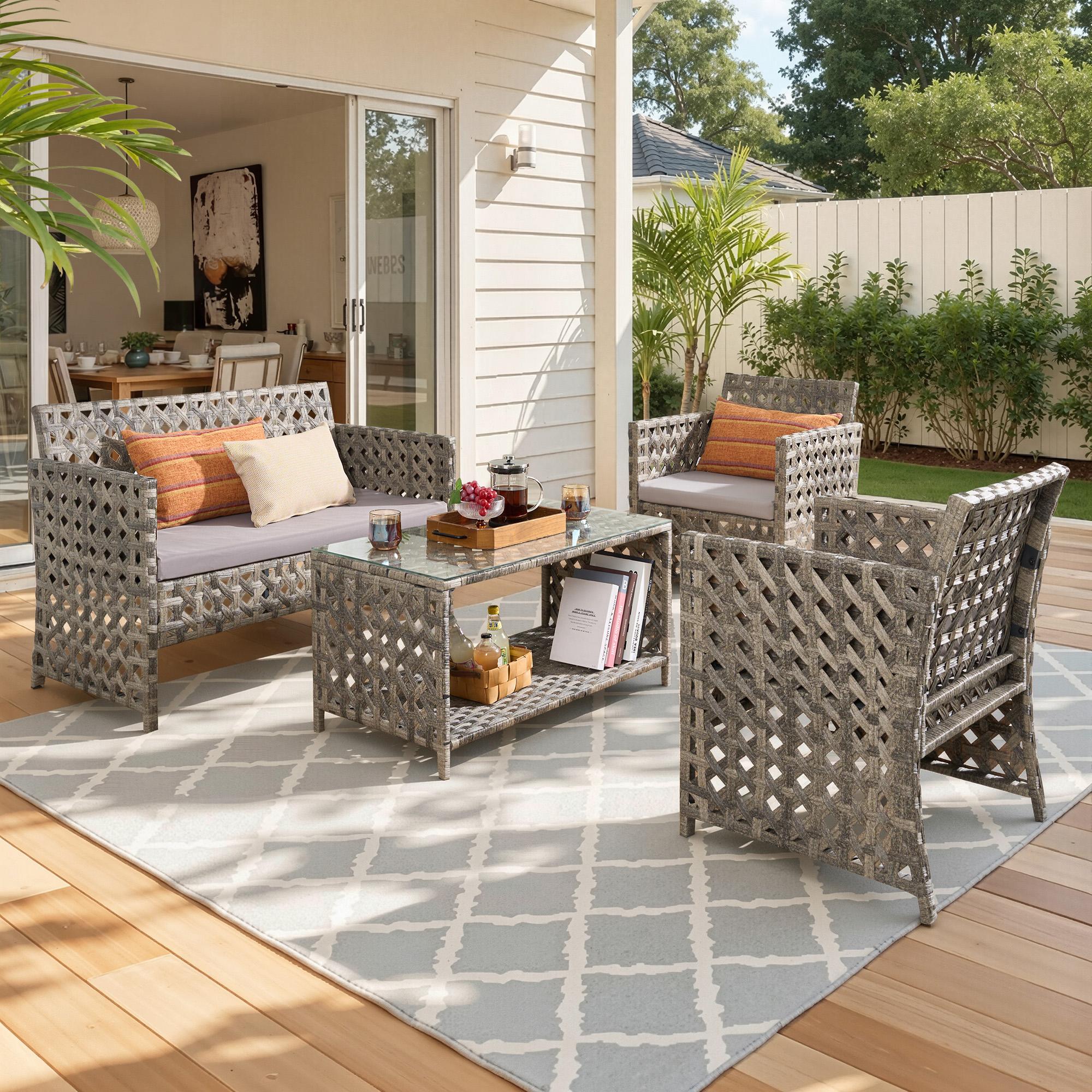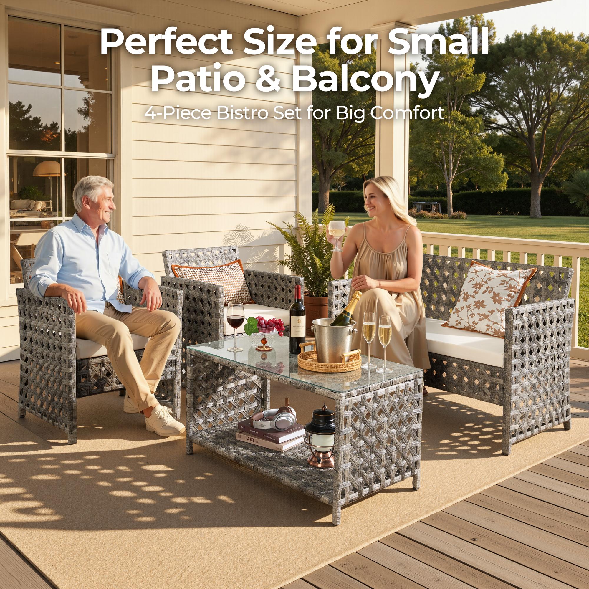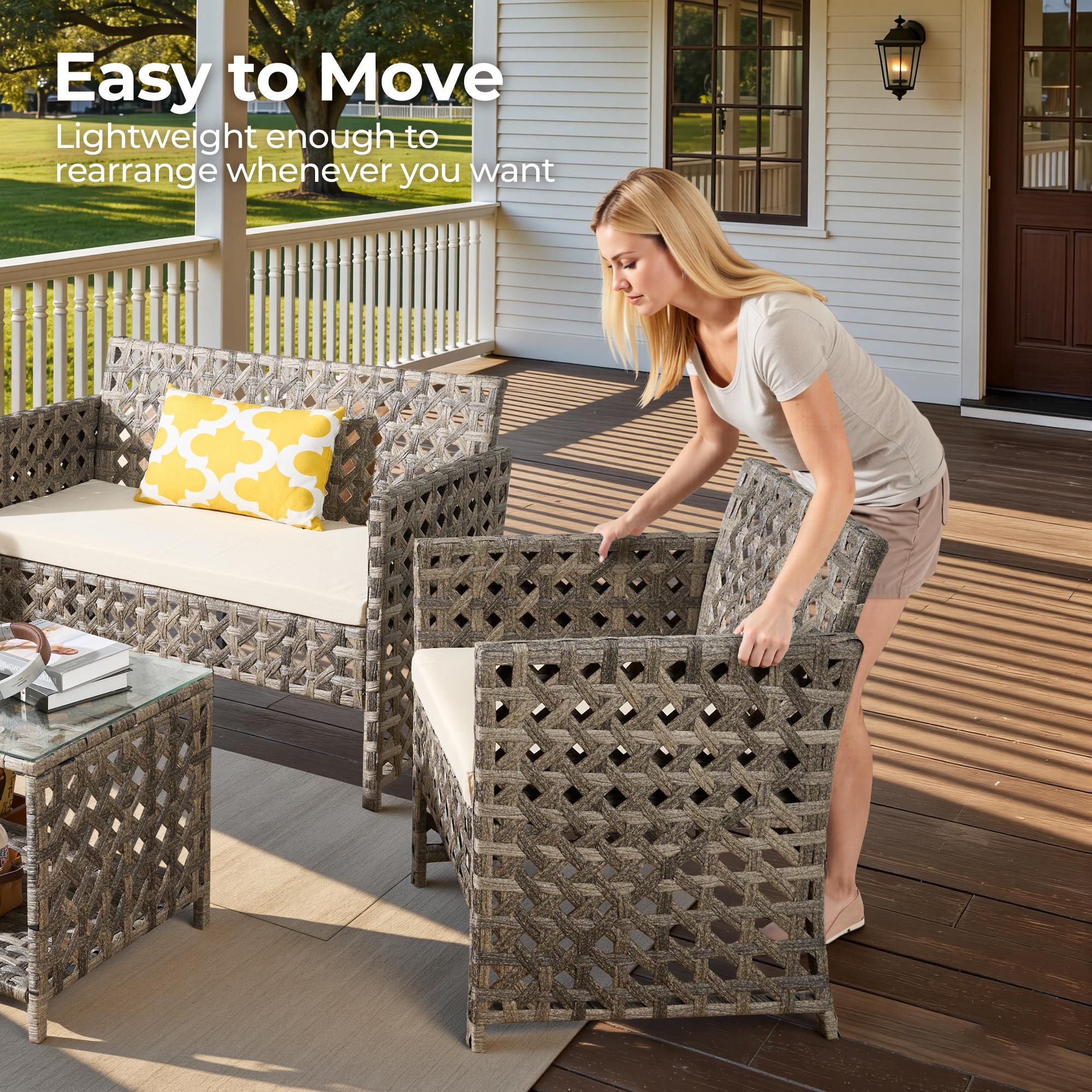 - DURABLE & WEATHER-RESISTANT: This 4-piece patio set features a rust-resistant steel frame and all-weather PE rattan for long-lasting durability. Includes a stylish, easy-to-clean glass-top table.