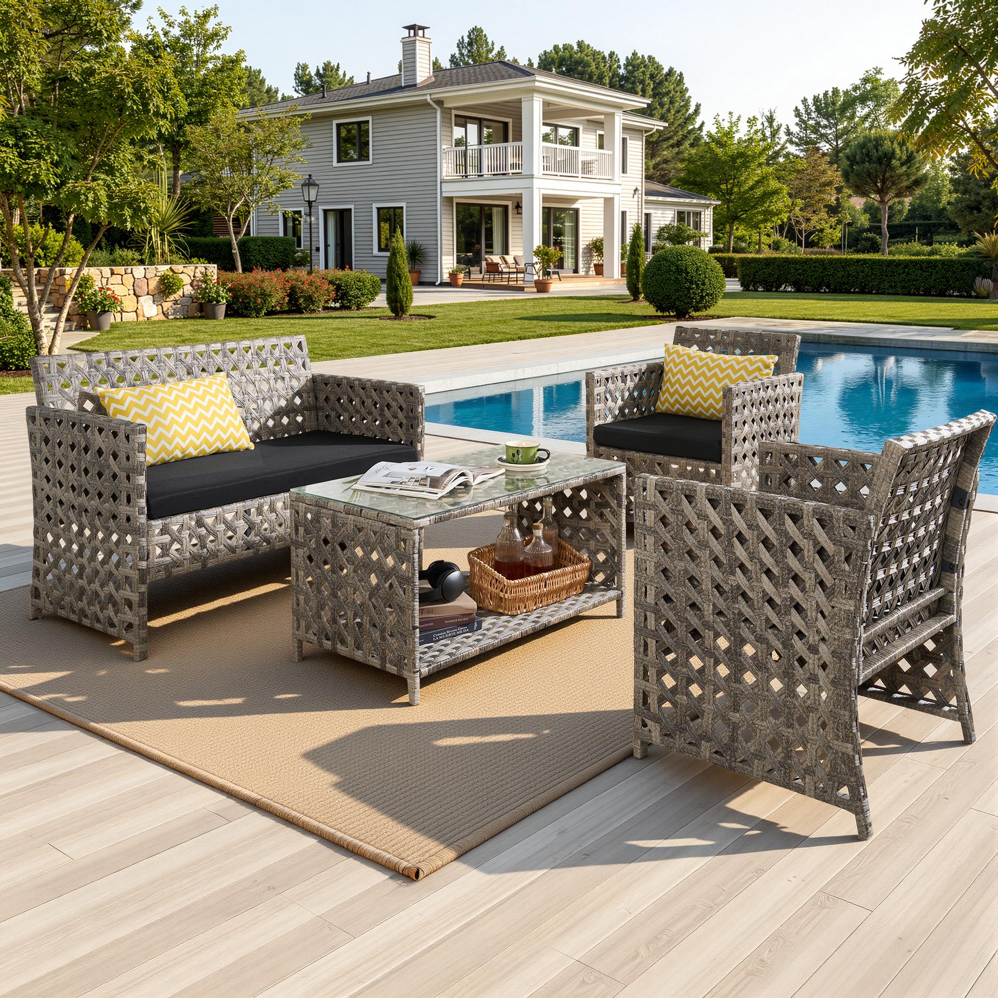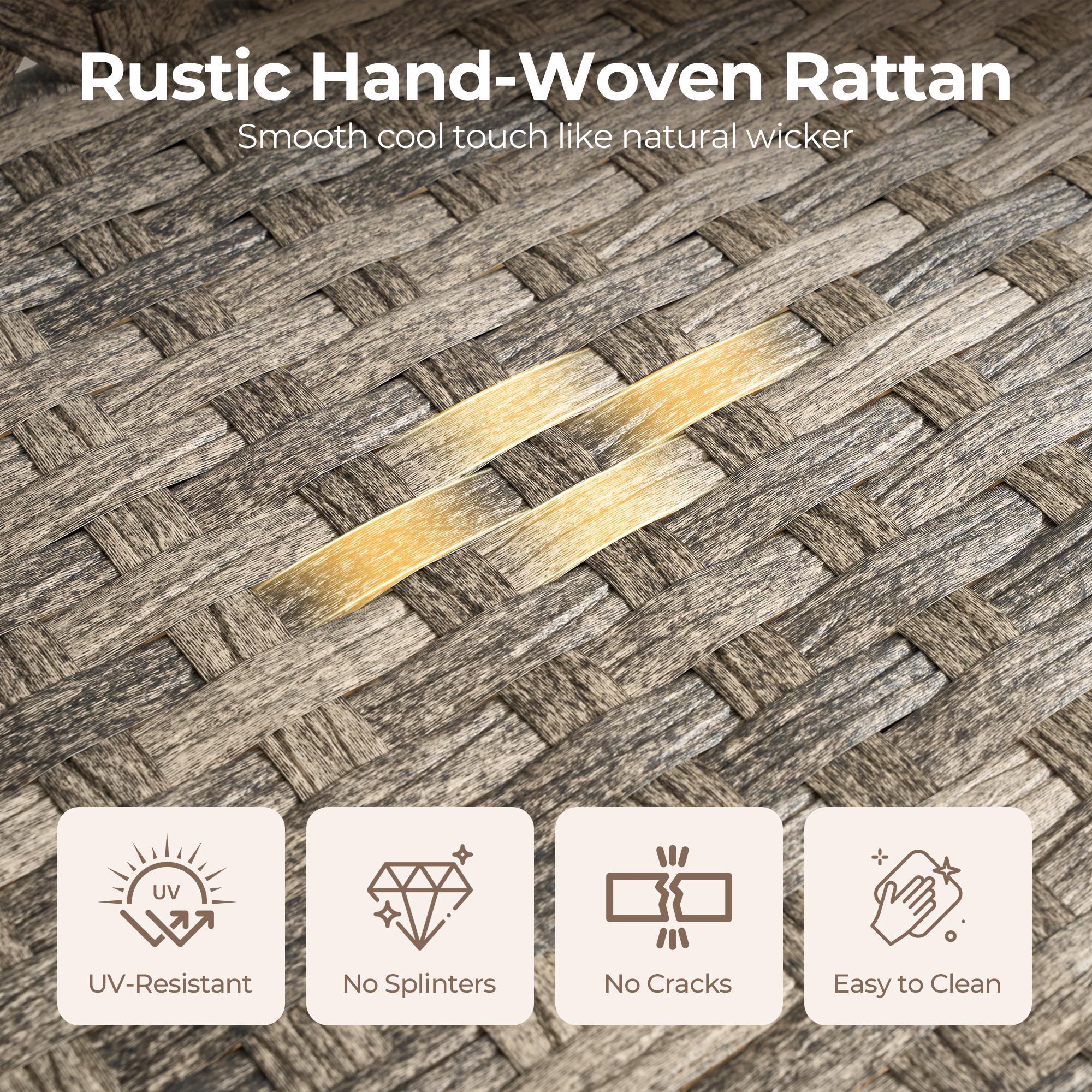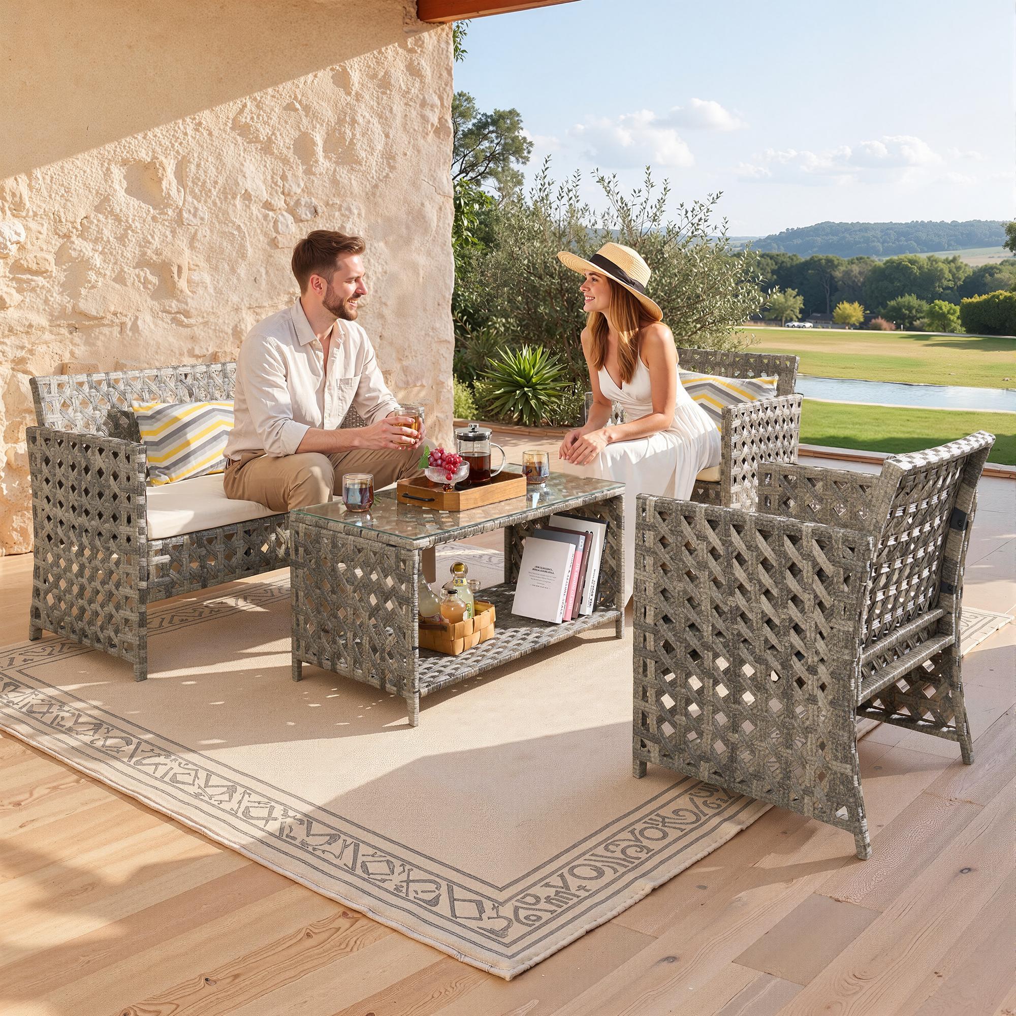 - DURABLE & WEATHER-RESISTANT: This 4-piece patio set features a rust-resistant steel frame and all-weather PE rattan for long-lasting durability. Includes a stylish, easy-to-clean glass-top table.