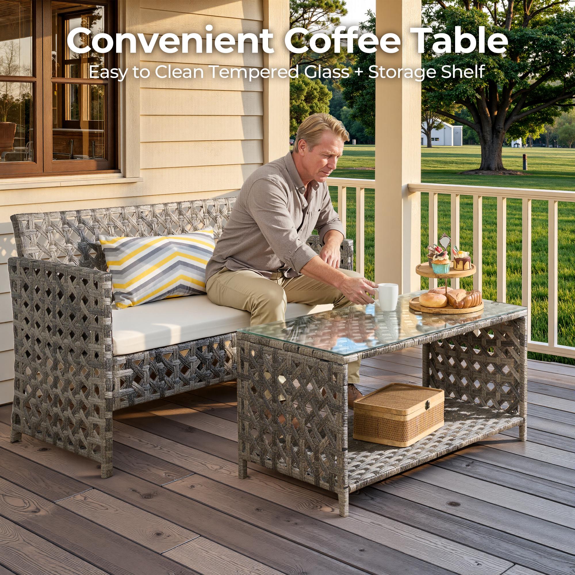 - MODERN STYLE: The patio set includes a double-layer table made of high-quality tempered glass for drinks, food, or décor. This sleek rattan design brings modern elegance and style to your outdoor furniture space.