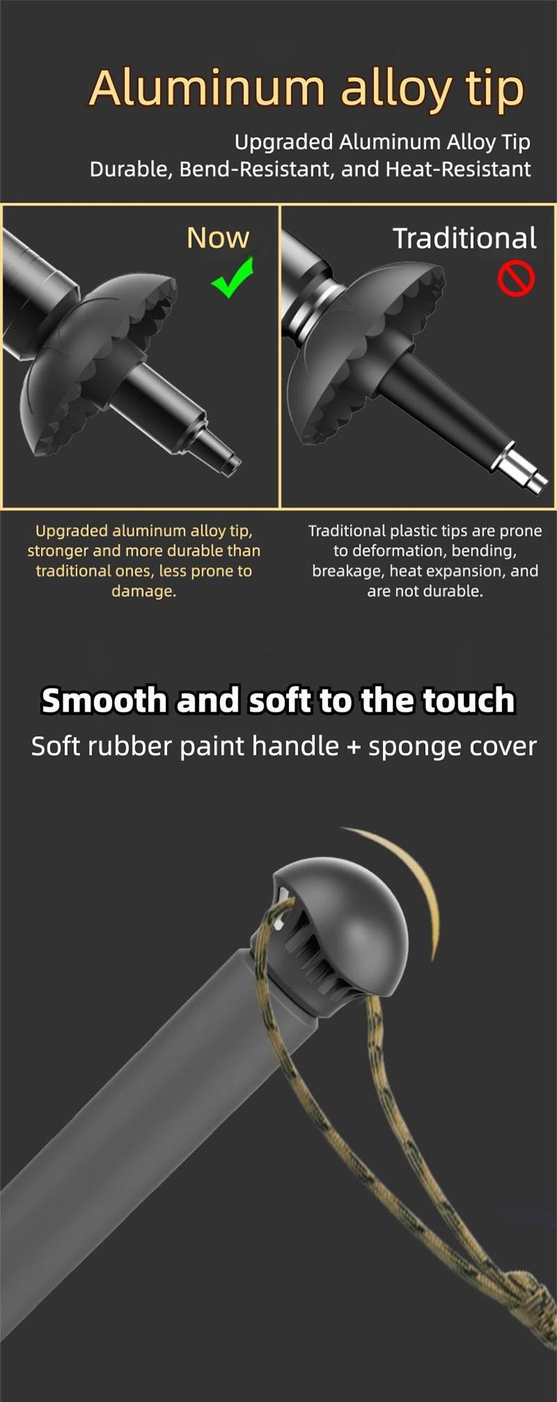Professional-grade LED trekking poles light your way safely in the dark 🚨. The added SOS red light provides a crucial distress signal for emergencies, giving you extra peace of mind.
